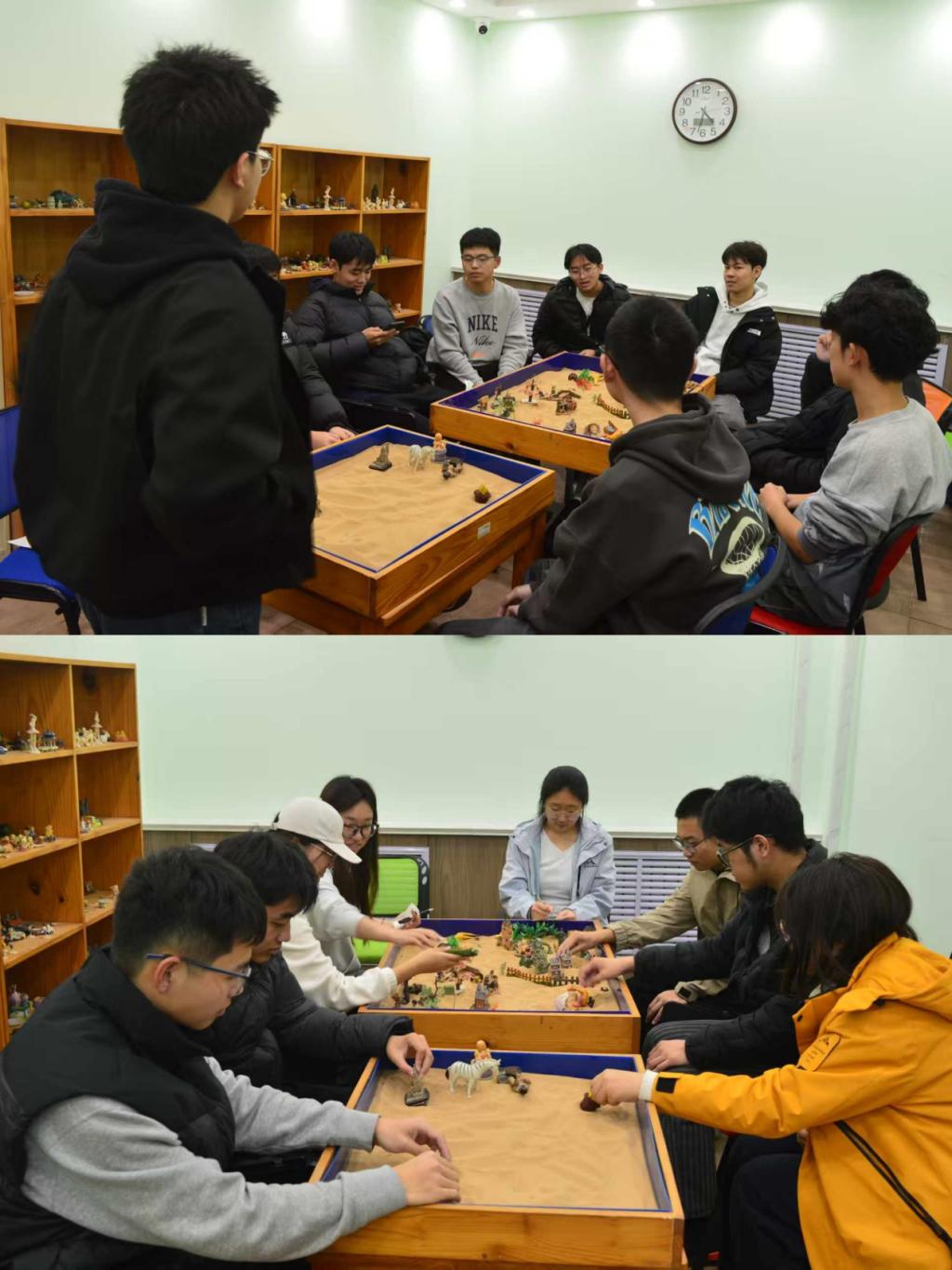 为筑牢大学生心理健康防线,学校在主题教育月期间开放心理功能室,将虚拟现实心理干预系统、智能击打宣泄仪、音乐放松椅、沙盘游戏等一系列“黑科技+治愈系”设备带到同学们身边。活动现场,每个功能区都配有专业讲解员:有的演示VR系统中的“情绪舒缓场景”,有的指导如何使用宣泄仪科学释放压力,还有的带领大家在沙盘中构建属于自己的“心灵小世界”。从聆听讲解到亲身体验,原本对心理设备感到陌生的同学们,很快便投入到轻松有趣的“疗愈之旅”中。“戴上VR眼镜的瞬间,仿佛真的走进了静谧森林,紧绷的神经一下子就放松了!”一位参与体验的同学分享道。