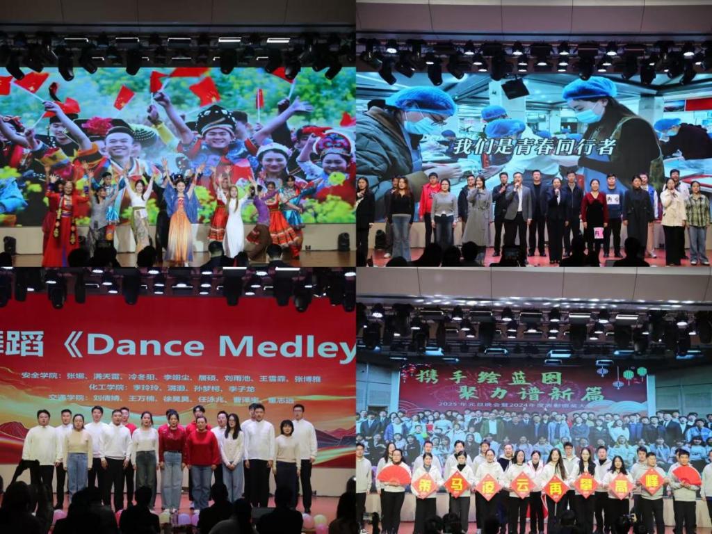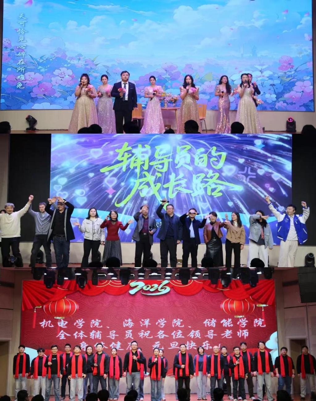 第一篇章“同心•扬帆起航”在材料学院与艺术学院合作的舞蹈《雪龙吟·象王行》中拉开帷幕,紧接着经管、测绘、地科学院的歌曲《New Boy》、自动化学院与电信学院的国风走秀《师韵风华,秀舞人生》,以现代灵动的舞姿与传统美学点燃现场氛围。晚会中还举办了新入职辅导员职业导师聘书颁发仪式,为新入职辅导员筑牢帮扶纽带。
