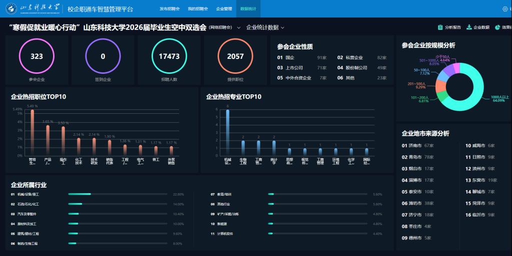 聚焦岗位供给,拓宽就业渠道。精准对接市场需求,基于2026届毕业生海外就业意向调研,举办海外就业专场招聘会,吸引20家青岛优质企业参会,提供海外就业岗位200余个。同时,举办“寒假促就业暖心行动”空中双选会,汇聚优质岗位资源,为毕业生提供便捷高效的“云端”求职渠道,已审核通过报名企业320余家。1月20日,就业中心组织安全、机电、外语等8个学院的30余名2026届本硕毕业生,走进赛轮集团、青岛松下点对点“送才入企”,为企业与毕业生“牵线搭桥”。